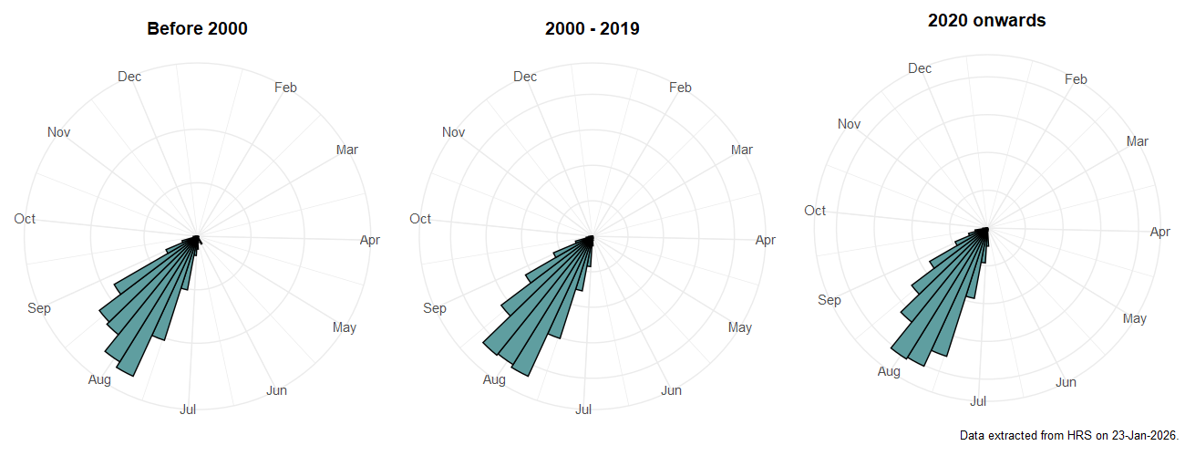 The following plots show the number of unique records per week excluding those reported to be of immature stages.