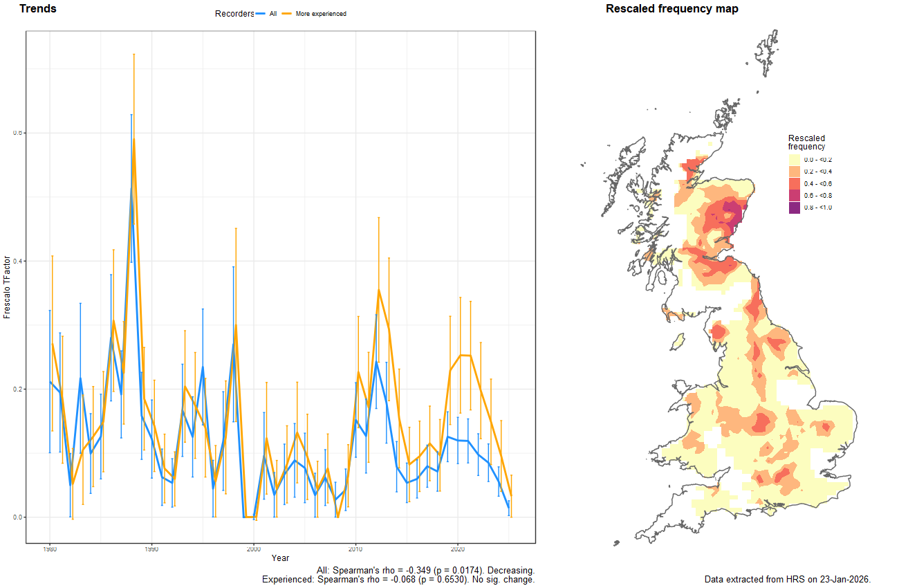 The following plots show the Frescalo TFactor vs year and a map of the rescaled frequency (all records) for the species.