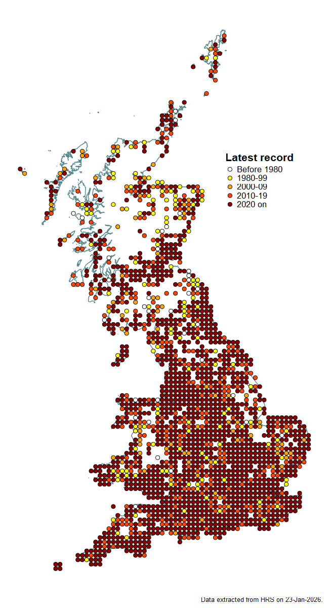 Widespread in the lowlands of the southern half of Britain. In northern England and southern Scotland records are noticeably clustered along the east coast, as one might expect for a migrant species. It seems to be scarce in north and west Scotland, although it is recorded in Shetland. The numbers of records received vary greatly between years.