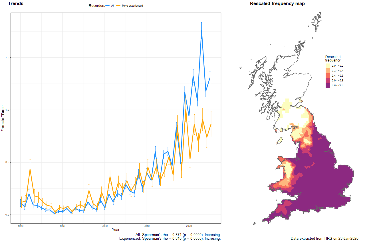 The following plots show the Frescalo TFactor vs year and a map of the rescaled frequency (all records) for the species.