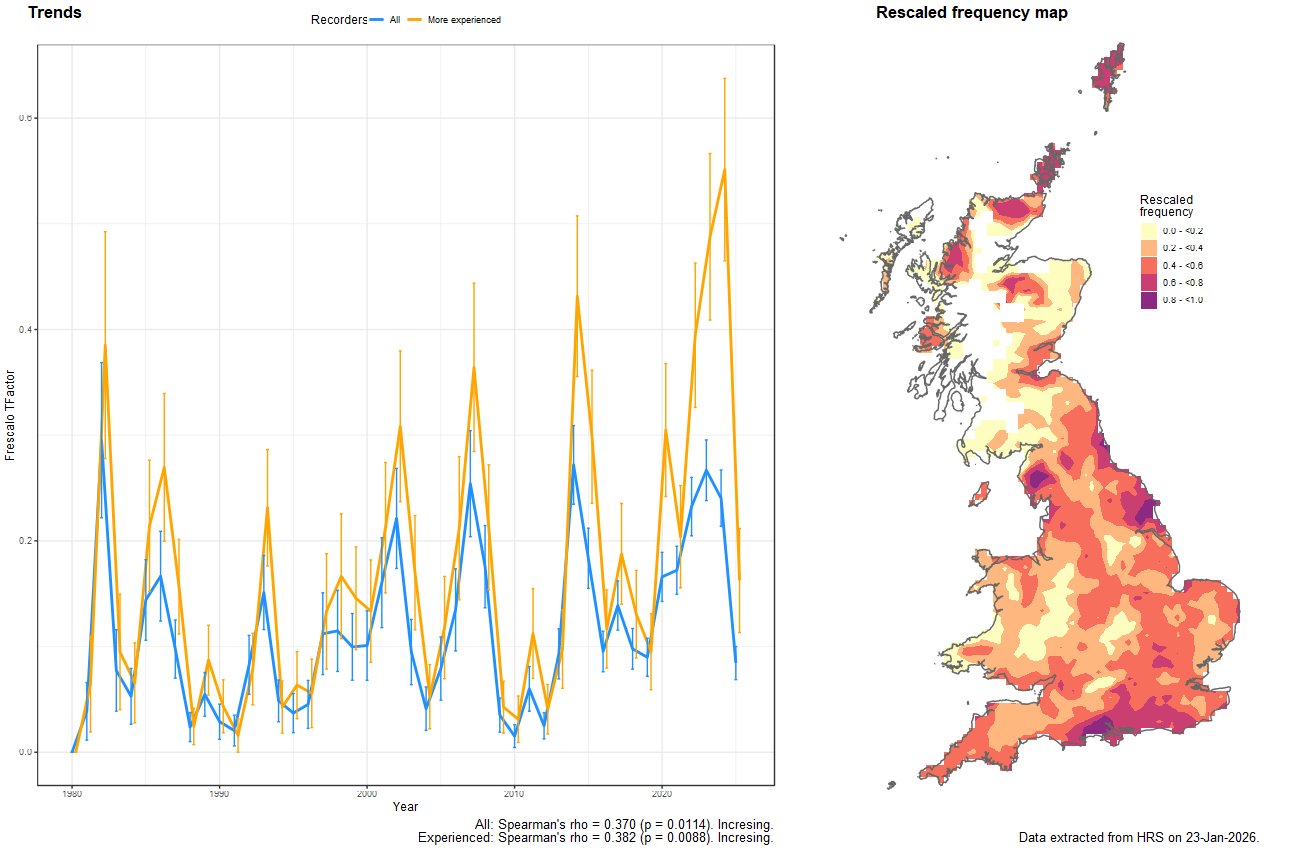 The following plots show the Frescalo TFactor vs year and a map of the rescaled frequency (all records) for the species.