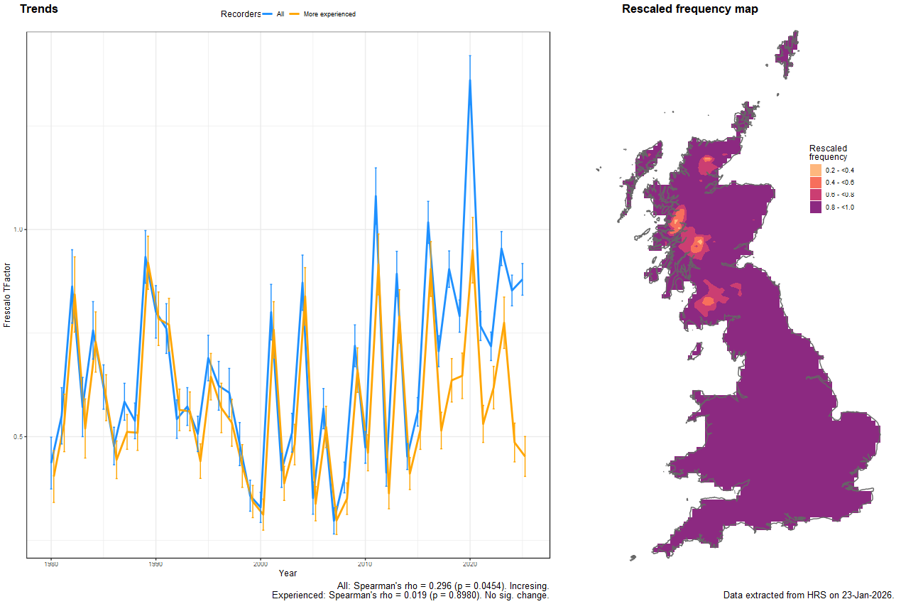 The following plots show the Frescalo TFactor vs year and a map of the rescaled frequency (all records) for the species.